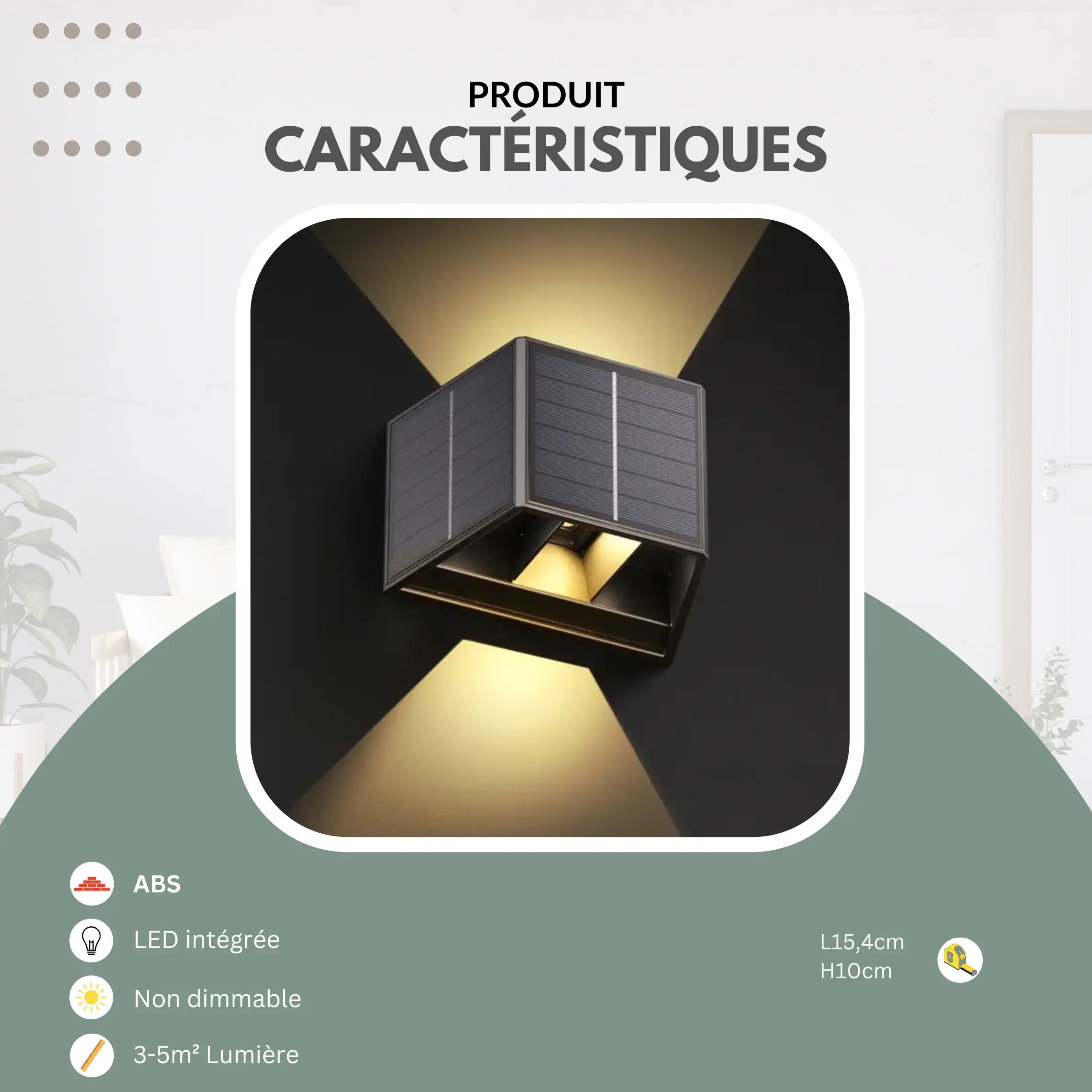 Cette applique murale solaire d’extérieur est réglable, et grâce à ses trois panneaux, vous profitez de lumière toute la nuit. Livrée avec une notice et des vis.