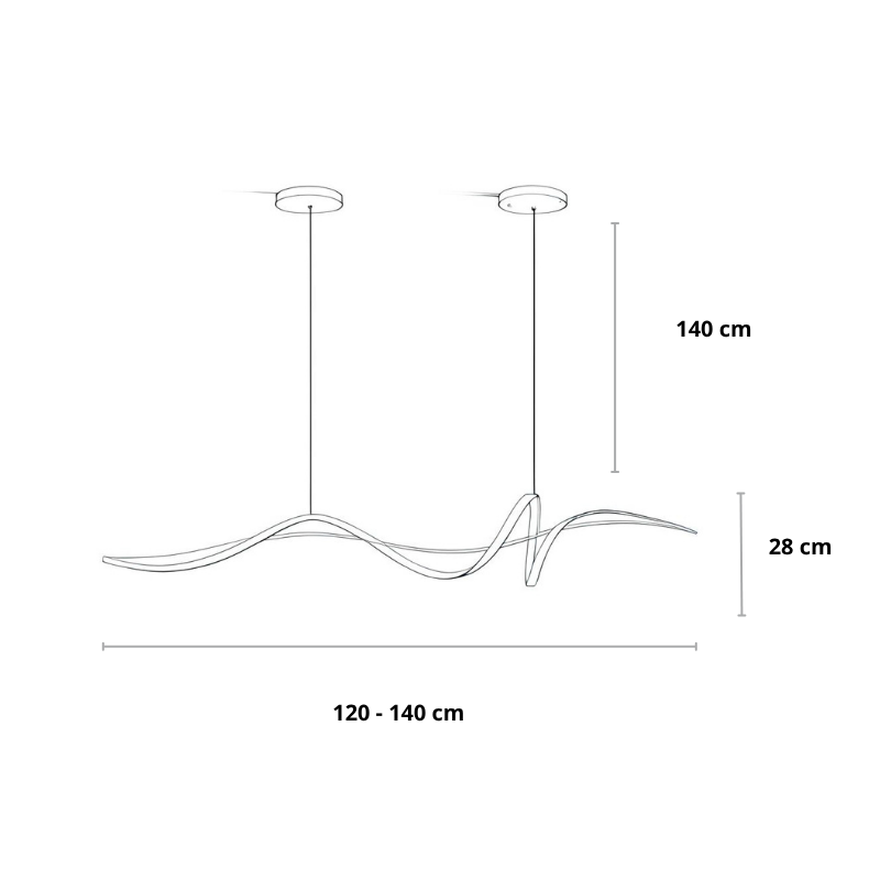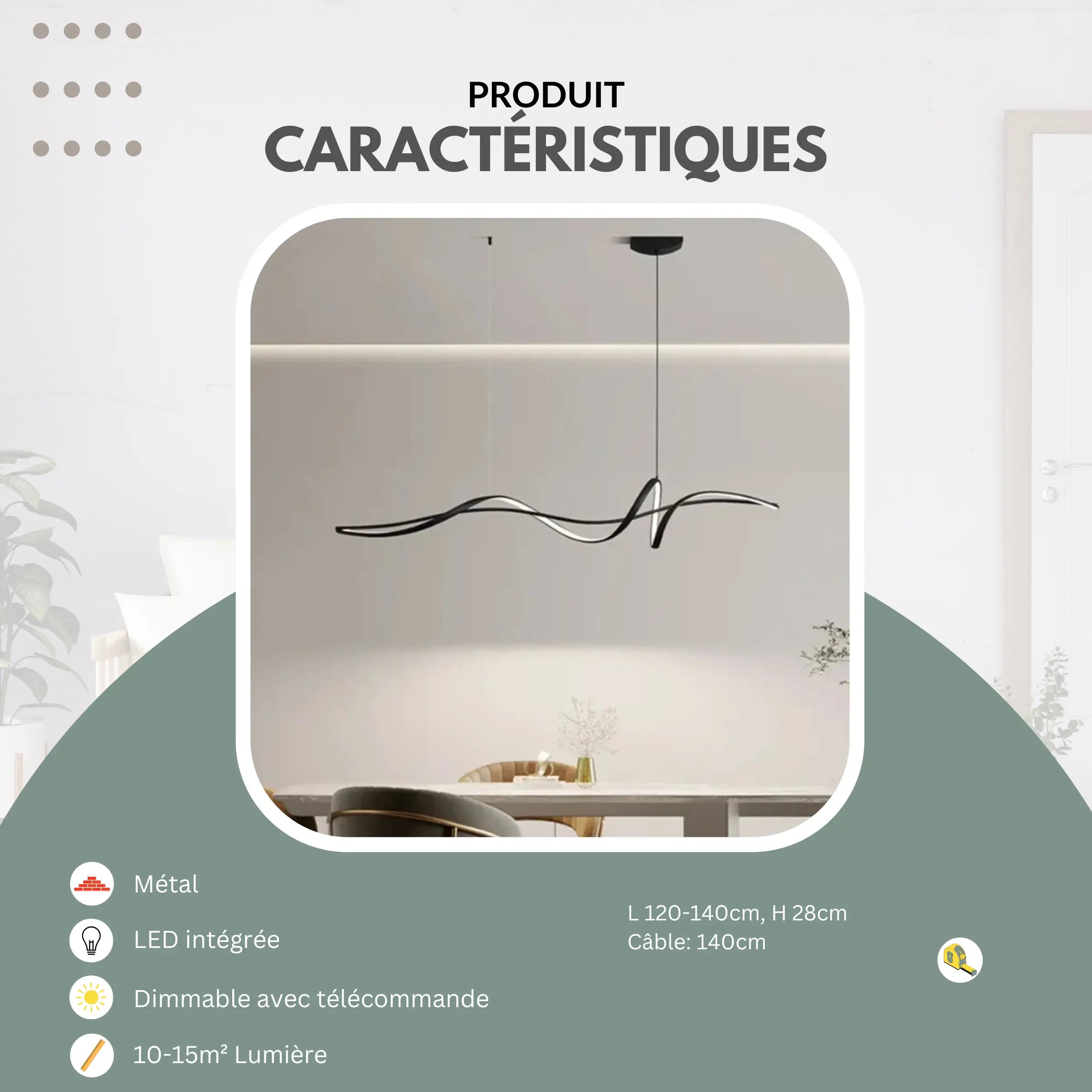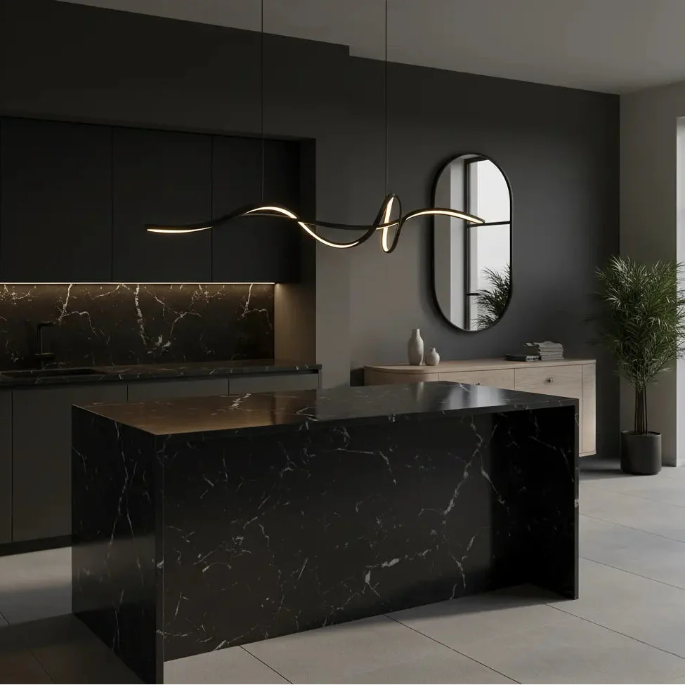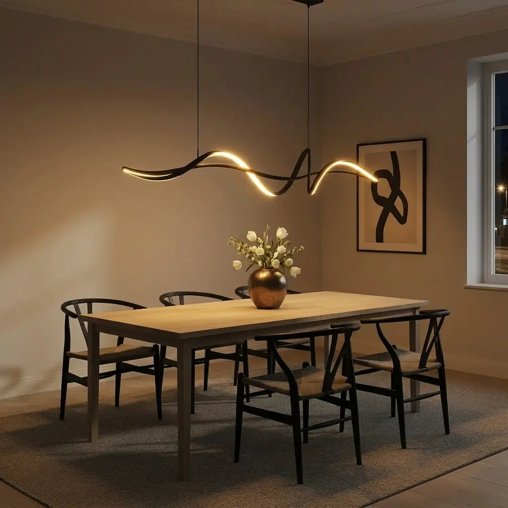 Suspension design élégante pour îlot de cuisine, avec bras incurvé. Crée une lumière chaleureuse et met en valeur les plans de travail dans les cuisines modernes.