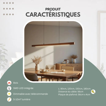 Cette suspension en bois allongée est parfaite pour au-dessus de l'îlot de cuisine ou de la table à manger.